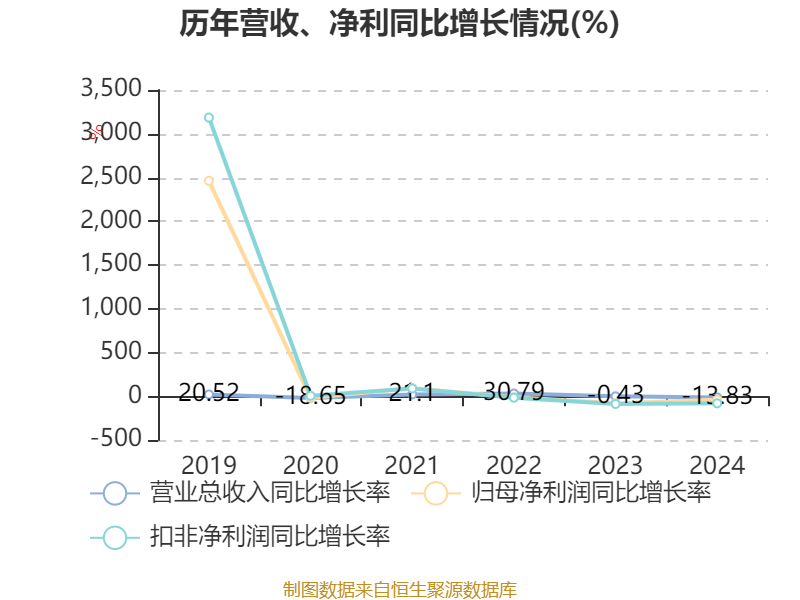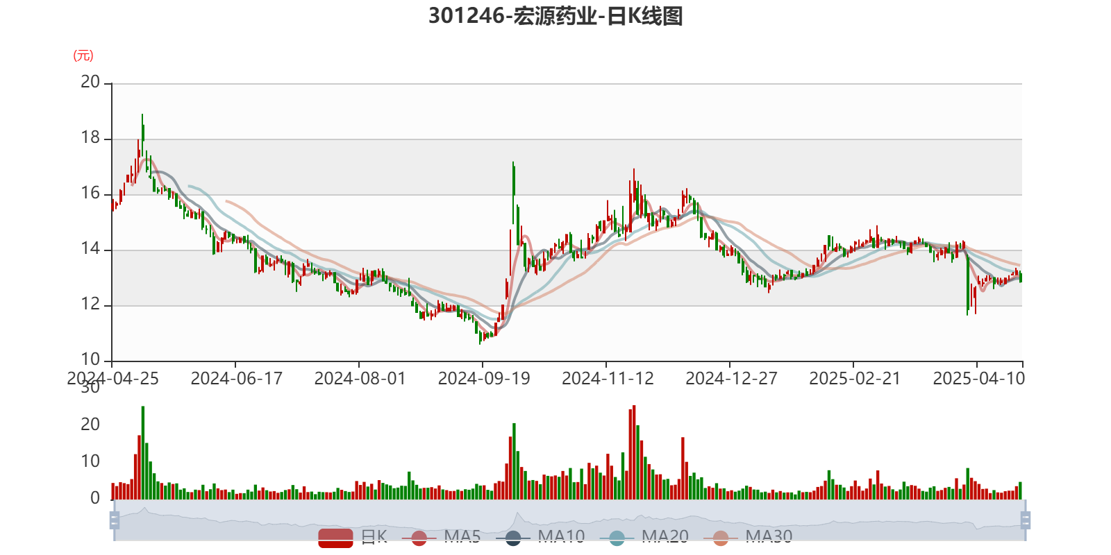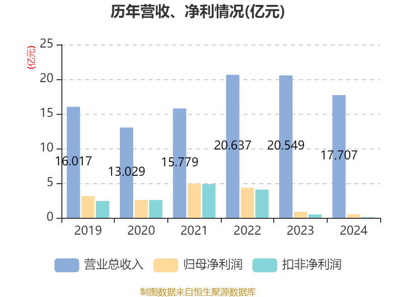 中证智能财讯宏源药业(301246)4月25日披露2024年年度报告。2024年,公司实现营业总收入17.71亿元,同比下降13.83%;归母净利润5146.51万元,同比下降40.96%;扣非净利润929.69万元,同比下降80.83%;经营活动产生的现金流量净额为-1580.97万元,上年同期为3525.04万元;报告期内,宏源药业基本每股收益为0.1291元,加权平均净资产收益率为1.18%。公司2024年度分配预案为:拟向全体股东每10股派现0.3元(含税)。