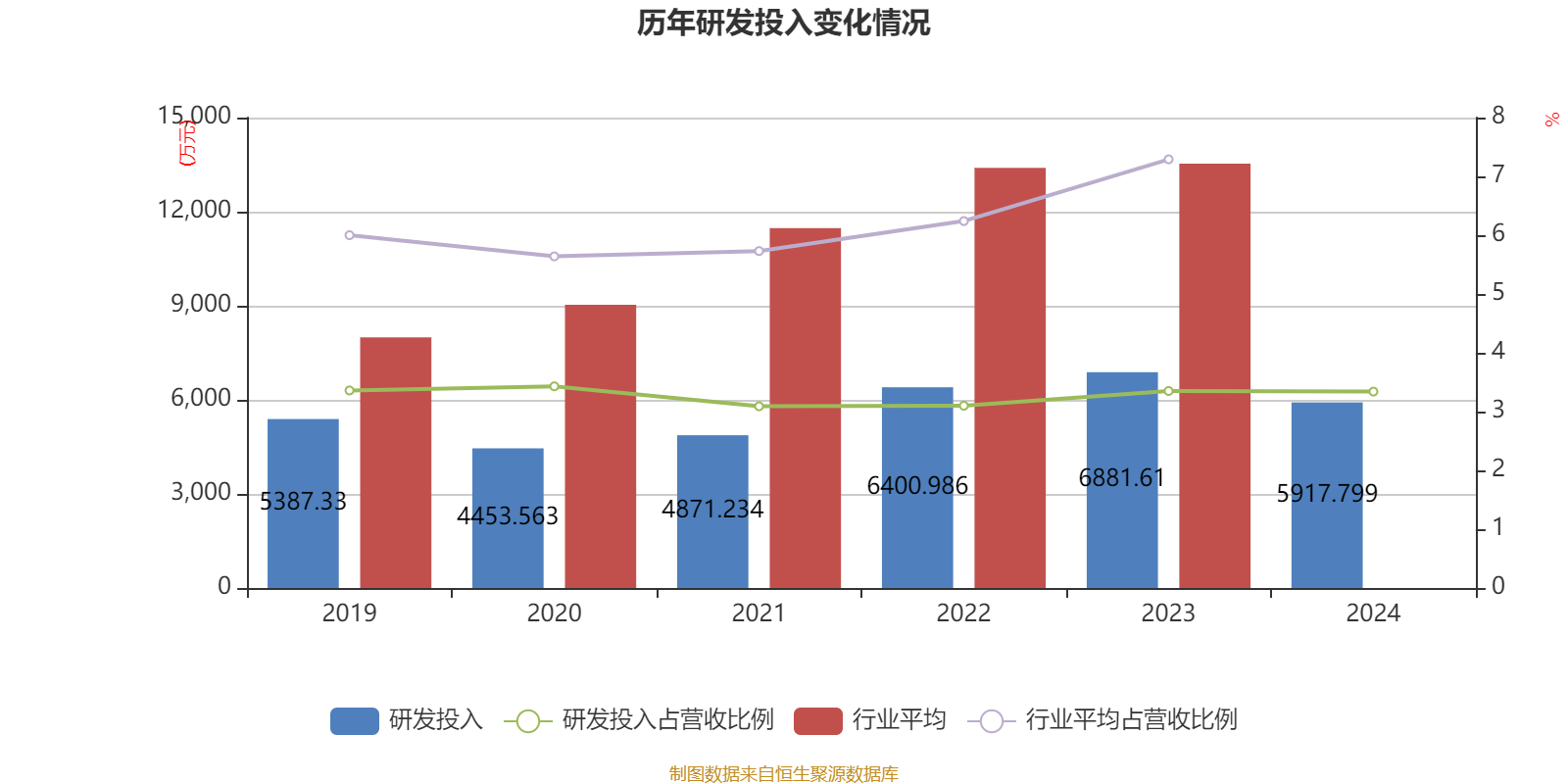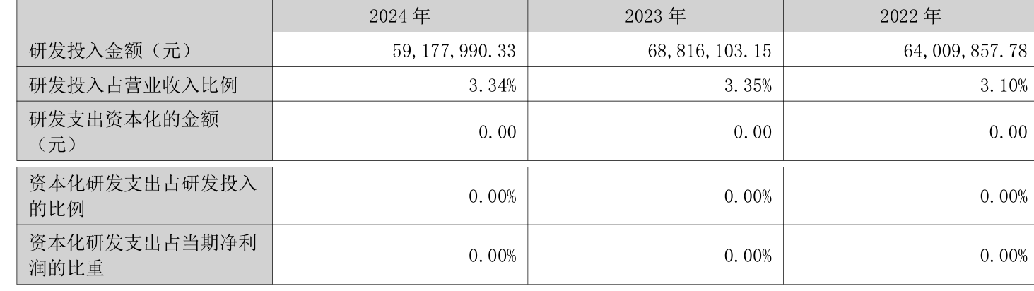 2024年全年,公司研发投入金额为5917.8万元,同比下降14.01%;研发投入占营业收入比例为3.34%,相比上年同期下降0.01个百分点。此外,公司全年研发投入资本化率为0%。