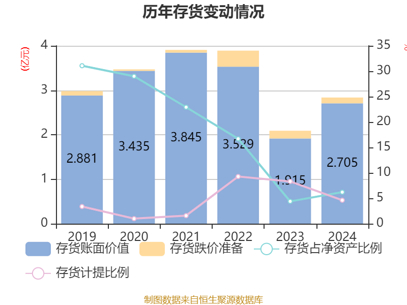 从存货变动来看,截至2024年末,公司存货账面价值为2.71亿元,占净资产的6.2%,较上年末增加7902.2万元。其中,存货跌价准备为1308.01万元,计提比例为4.61%。