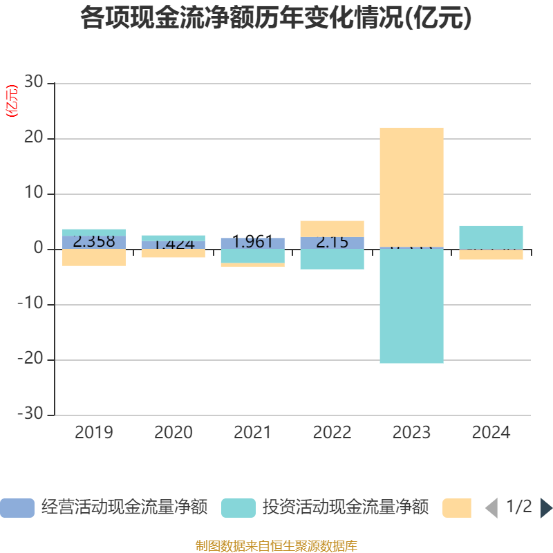 截至2024年,公司经营活动现金流净额为-1580.97万元,同比减少5106.01万元;筹资活动现金流净额-1.77亿元,同比减少23.3亿元;投资活动现金流净额4.14亿元,上年同期为-20.69亿元。