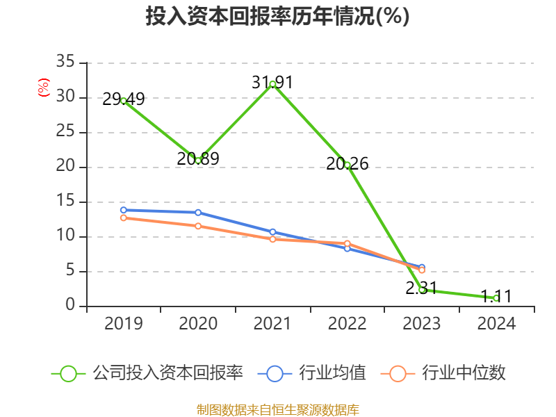 数据显示,2024年公司加权平均净资产收益率为1.18%,较上年同期下降1.12个百分点。公司2024年投入资本回报率为1.11%,较上年同期下降1.2个百分点。