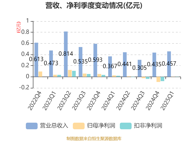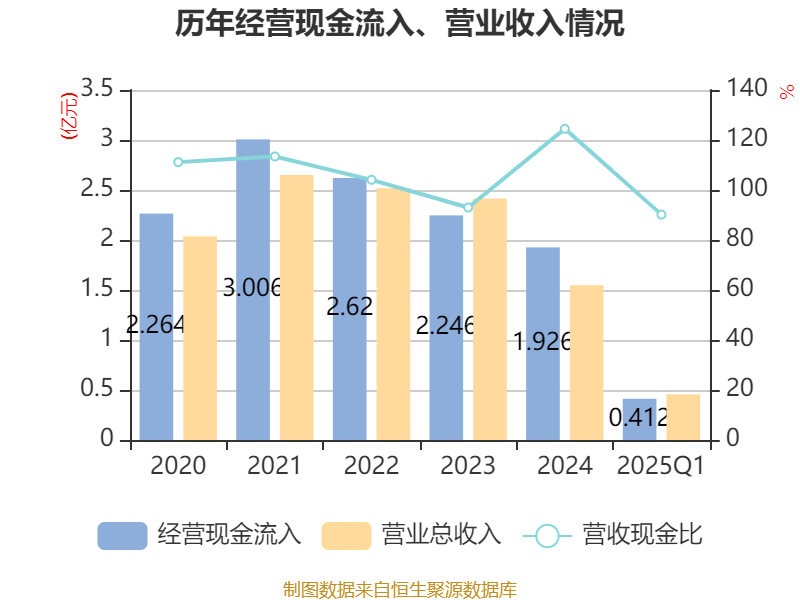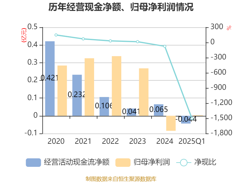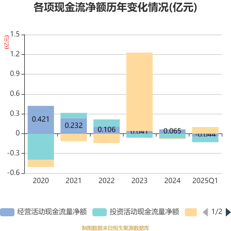 截至2025年一季度末,公司经营活动现金流净额为-436.09万元,同比增加1194.98万元;筹资活动现金流净额1000万元,同比减少883.7万元;投资活动现金流净额-861.24万元,上年同期为-1187.56万元。