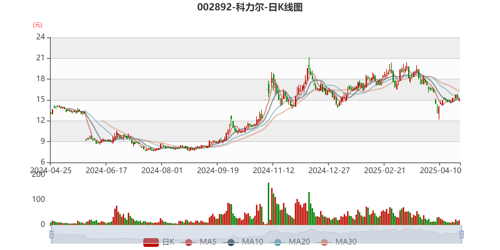 以4月24日收盘价计算,科力尔目前市盈率(TTM)约为158.74倍,市净率(LF)约7.42倍,市销率(TTM)约5.76倍。