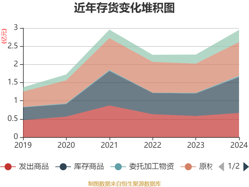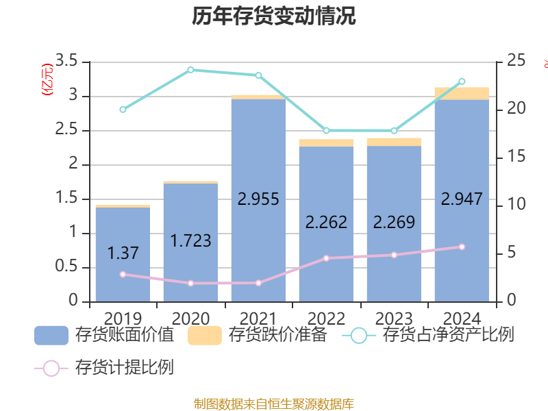 从存货变动来看,截至2024年末,公司存货账面价值为2.95亿元,占净资产的22.94%,较上年末增加6778.84万元。其中,存货跌价准备为1777.03万元,计提比例为5.69%。