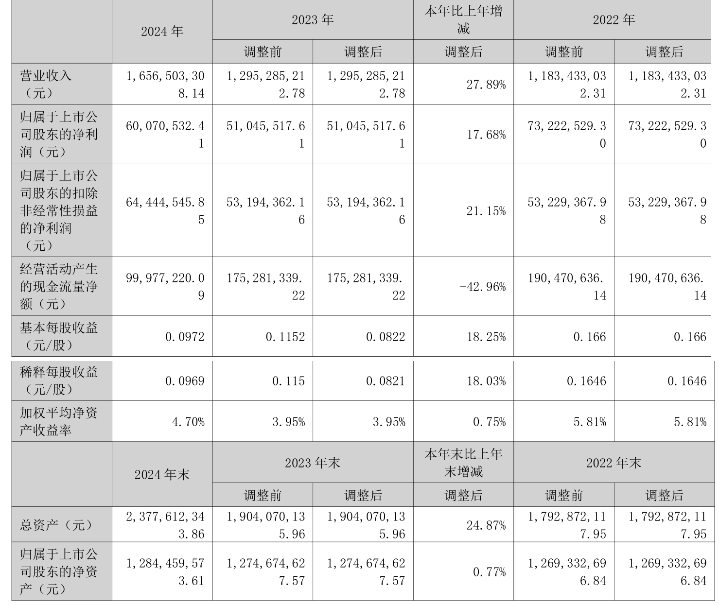 中证智能财讯科力尔(002892)4月25日披露2024年年度报告。2024年,公司实现营业总收入16.57亿元,同比增长27.89%;归母净利润6007.05万元,同比增长17.68%;扣非净利润6444.45万元,同比增长21.15%;经营活动产生的现金流量净额为9997.72万元,同比下降42.96%;报告期内,科力尔基本每股收益为0.0972元,加权平均净资产收益率为4.70%。公司2024年度分配预案为:拟向全体股东每10股转2股,派现0.5元(含税)。