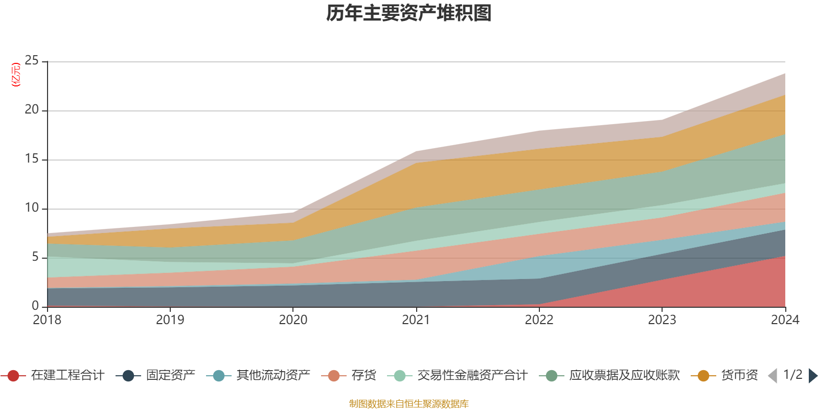 资产重大变化方面,截至2024年末,公司在建工程合计较上年末增加88.42%,占公司总资产比重上升7.33个百分点;其他流动资产较上年末减少43.64%,占公司总资产比重下降4.14个百分点;应收票据及应收账款较上年末增加46.61%,占公司总资产比重上升3.11个百分点;交易性金融资产合计较上年末减少23.53%,占公司总资产比重下降2.59个百分点。